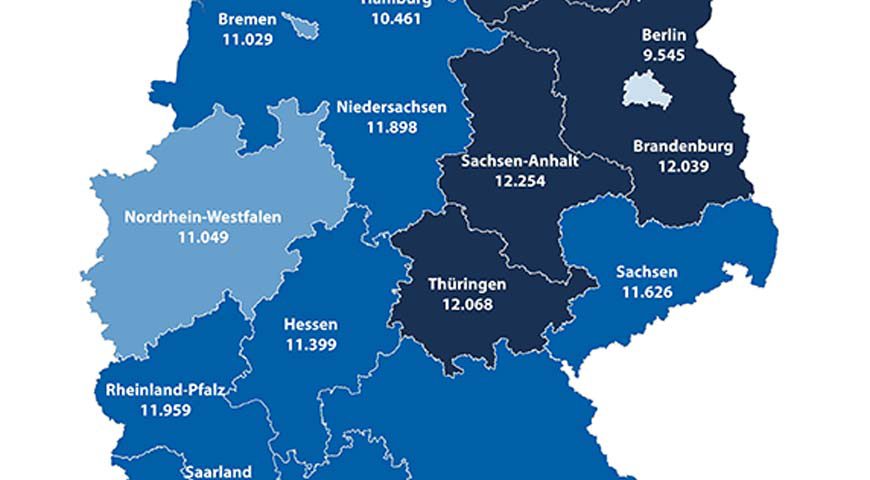 Die meisten Kilometer absolvieren die Autofahrer in Mecklenburg-Vorpommern. Sie kommen auf 12.813 Kilometer. Auf den Plätzen zwei und drei folgen die Bundesländer Schleswig-Holstein (12.446 Kilometer) und Sachsen (12.254 Kilometer). Schlusslicht ist Berlin mit 9.545 Kilometern. Auch in den Stadtstaaten Hamburg (10.461 Kilometer) und Bremen (11.029 Kilometer) wird deutlich weniger gefahren als im Schnitt.