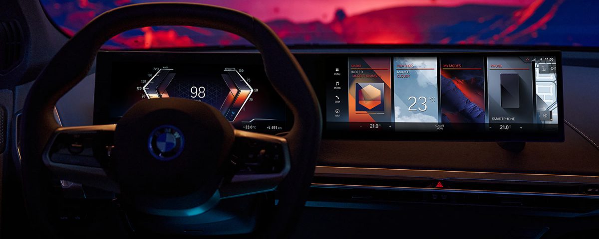Drittes zentrales Element des neuen „Operating System 8“ ist ein großer konkaver Bildschirm, der sich vom Instrumentenbrett bis in die Mittelkonsole zieht. Die Darstellung auf dem berührungsempfindlichen Curved-Display lässt sich ebenso wie die Tachodaten personalisieren. Im Gegensatz zu vielen Wettbewerbern erlaubt BMW auch die Integration von Drittanbieter-Apps; unter anderem sollen die Nutzer nahtlos zwischen dem Hersteller-Infotainment und Inhalten von Apple Car Play oder Android Auto wechseln können. Für die Verbindung zur Außenwelt sorgt ein 5G-Modul, über das auch Fernwartungs-Aktualisierungen, sogenannte Over-the-Air-Updates, möglich sind.