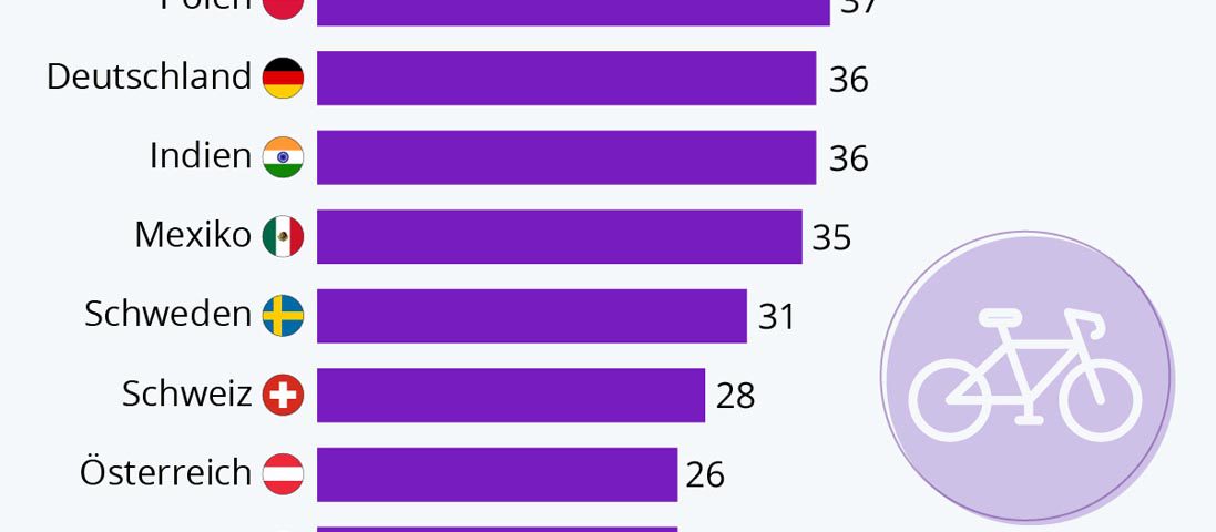 In Deutschland greifen nach einer Statista-Umfrage 36 Prozent der Befragten mindestens zwei bis fünfmal die Woche zum Fahrrad. Damit liegen die Deutschen mit Indien auf Platz 3. Spitzenreiter sind die Niederlande. Hier steigen 58 Prozent regelmäßig aufs Rad. Auf Rang 2 kommt Polen (37 Prozent). Schlusslicht der Statista-Grafik ist Frankreich. Nur 18 Prozent der Befragten gaben an regelmäßig Fahrrad zu fahren.