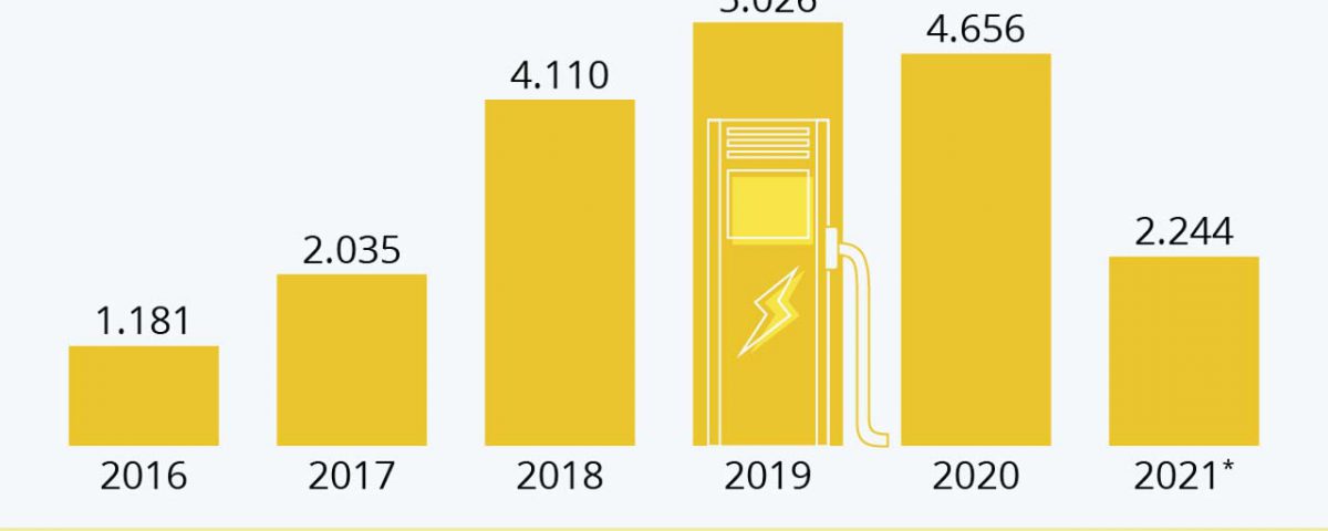 2016 gab es erst 1.181 neue Ladesäulen, im Jahr danach schon fast doppelt so viele (2.035). 2018 verzweifachte sich die Anzahl der Neuinstallationen erneut auf 4.110 Einheiten. Bislang bestes Jahr beim Ausbau war 2019 mit 5.025 neuen Ladsäulen.