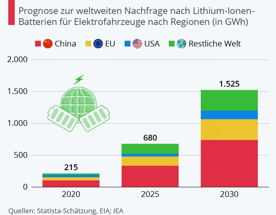 Der Bedarf an Lithium-Ionen-Batterien für Elektrofahrzeuge wird in den nächsten zehn Jahren stark ansteigen. Eine Statista-Schätzung geht davon aus, dass 2025 Batteriekapazitäten von 680 Gigawattstunden (GWh) […]